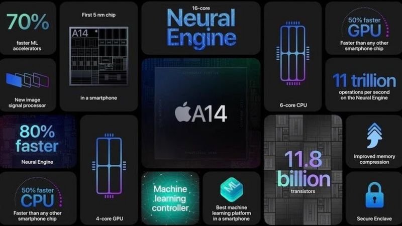 ایپل کا کہنا ہے کہ نئے ورژن کے آئی فونز میں جدید ترین چپ اے 14 بایونک چپ لگی ہوئی ہے جسے فائیو نینو میٹر پروسیس پر تیار کیا گیا ہے۔